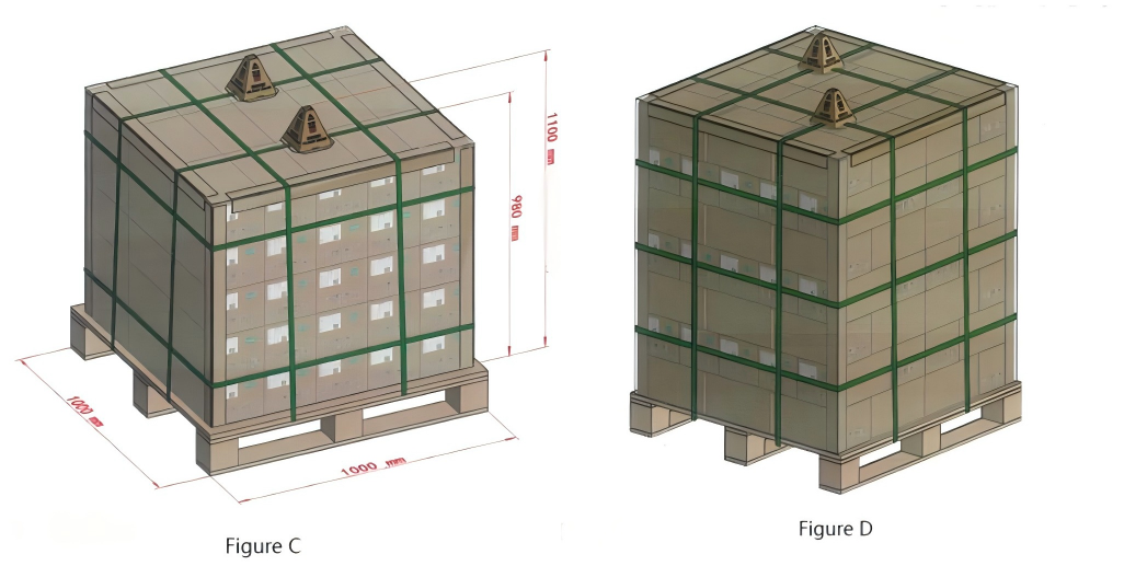 When transported by land or air, there are 15 boxes on each layer of the cardboard, stacked < 5 layer,as showed in Figure C. When transported by sea, there are 16 boxes on each layer of the cardboard, stacked < 7 layers,as showed in Figure D.